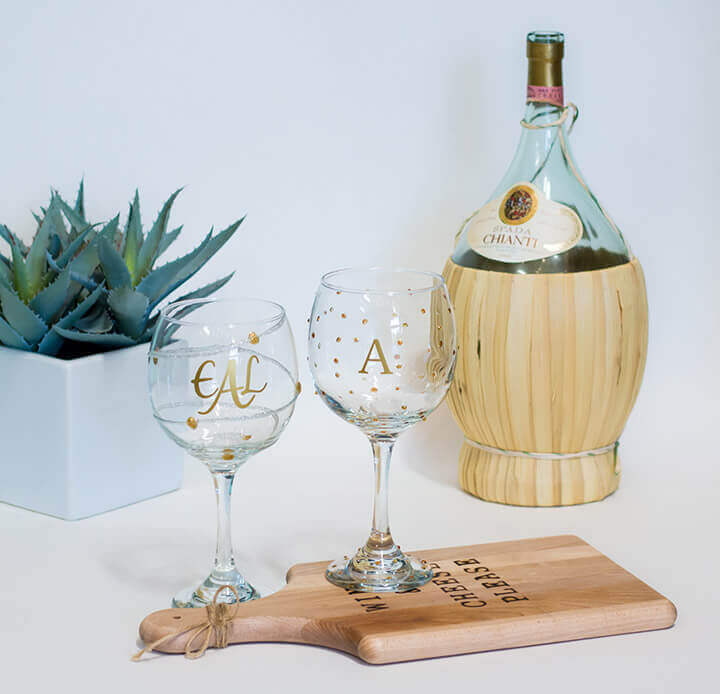 Cheers to love with a set of custom wine glasses! This wedding gift is perfect for wine lovers. All you need for this easy but thoughtful wedding gift are some wine glasses, enamel paint, and paint brushes.