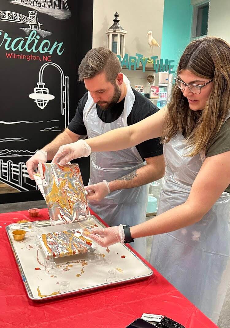 If you love the idea of making art but want something structured and soothing, our acrylic pour date package may be just what you’ve been looking for. Using swirling, marbled pours, you create two beautiful canvases that pair together like a matching set. Simply pick your colors, then tilt and swirl to watch your unique design form. It’s the perfect Wilmington date night for artsy couples looking to bond in a creative, meditative way.