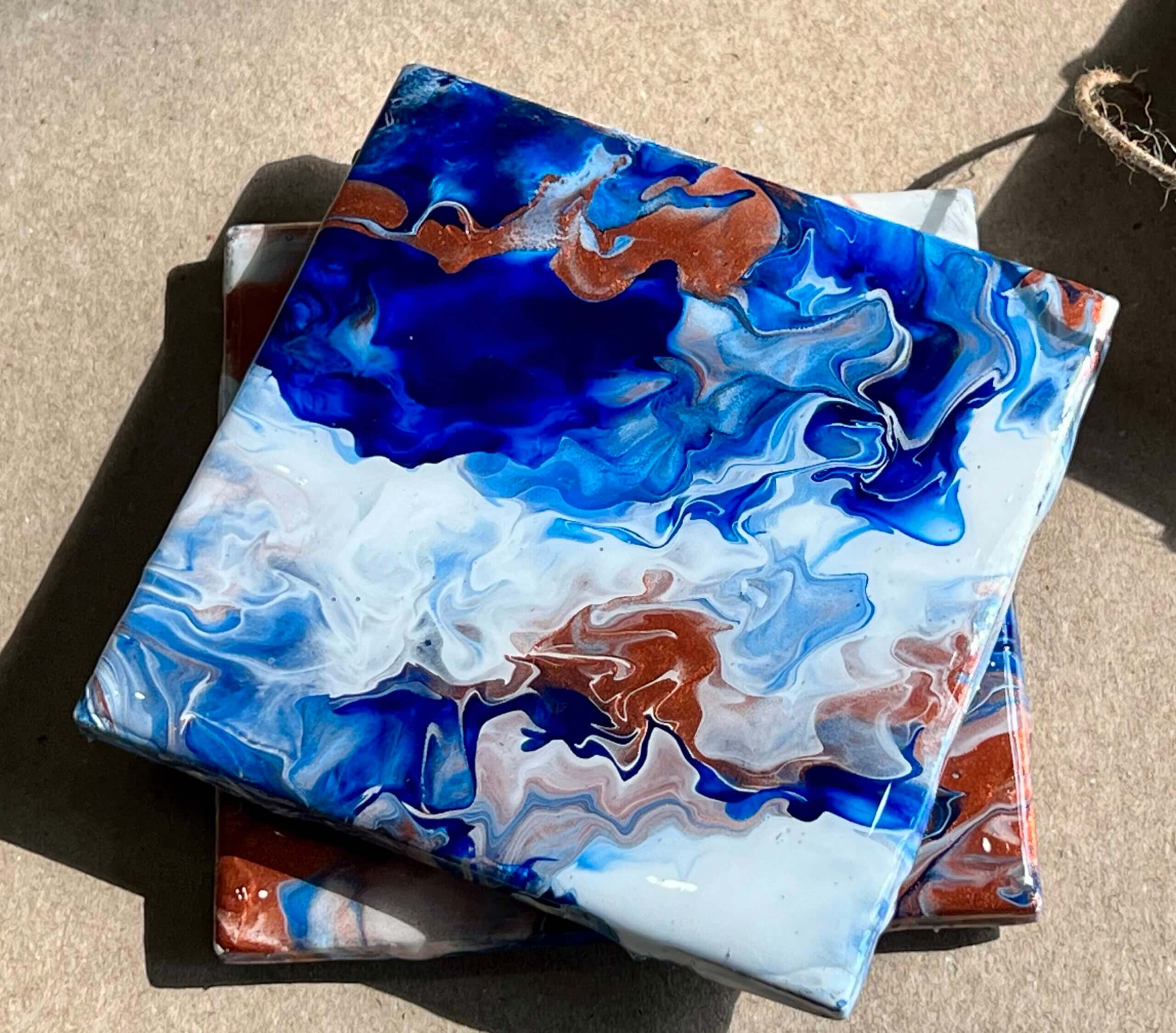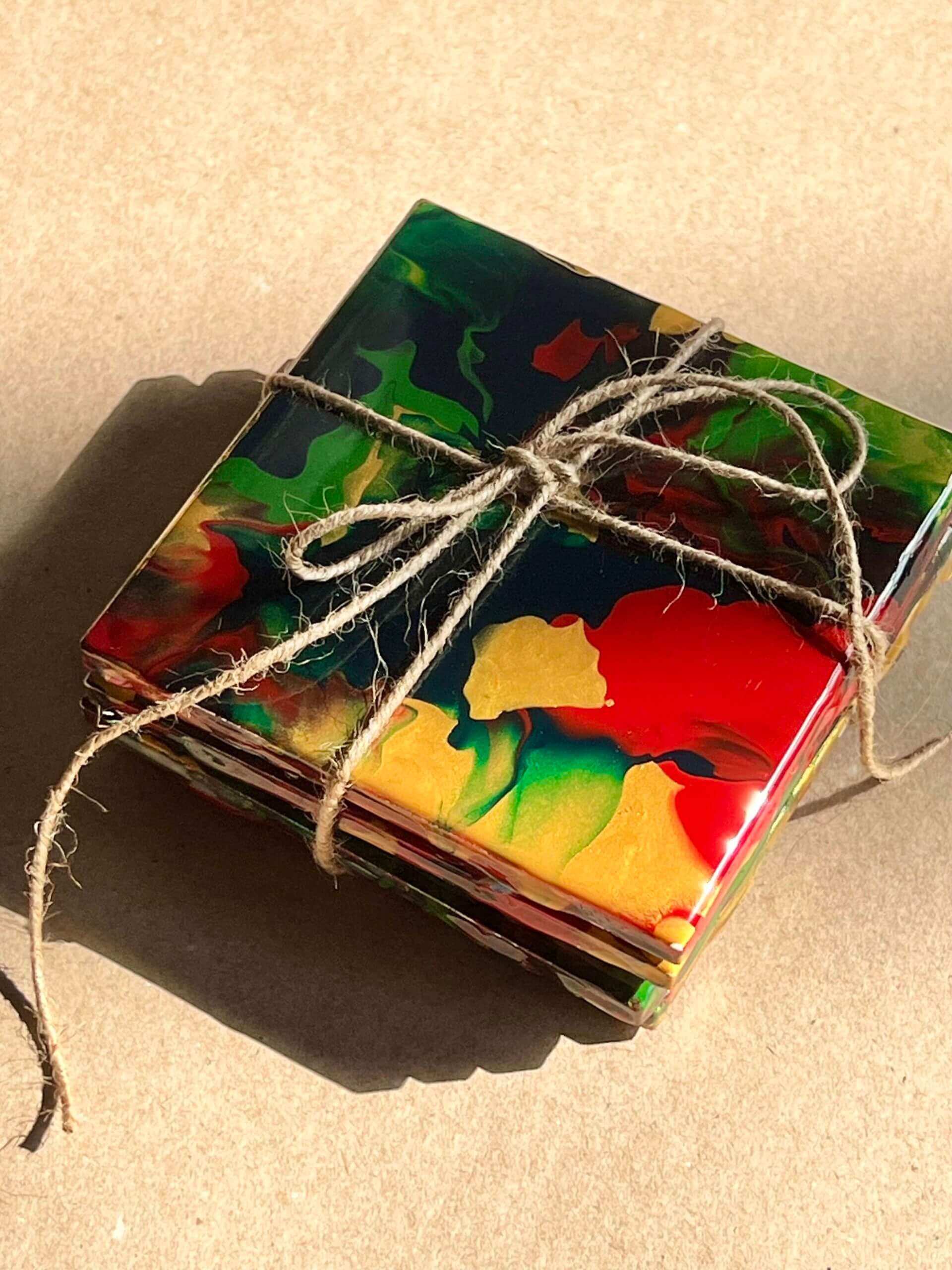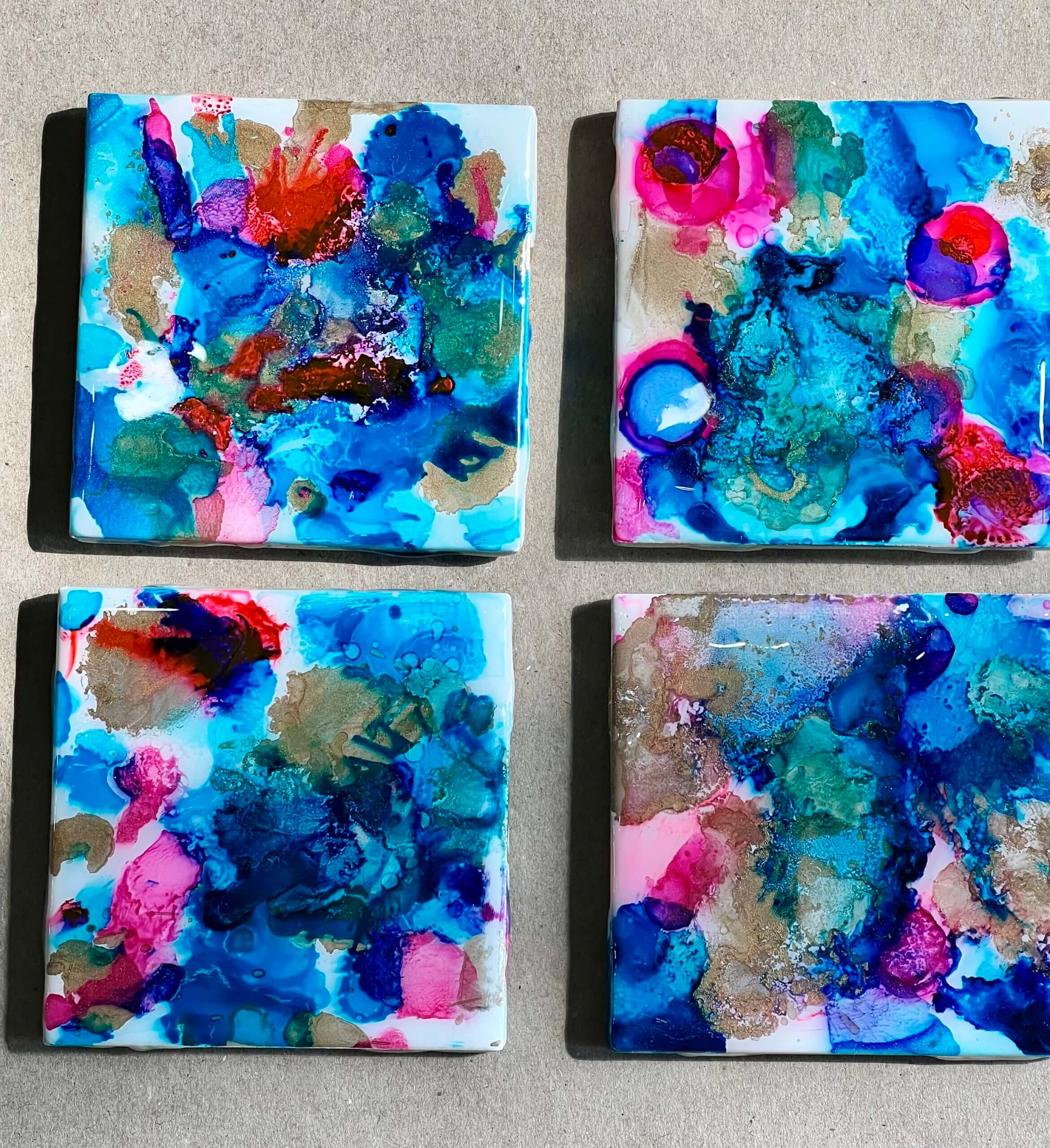 We have two different options, alcohol ink or acrylic pour. You can choose a set of 4 or 6. All coasters must be made with the same finish technique. You will have something that is both functional and beautiful! These coasters are made out of ceramic tile and then finished with a layer of food safe resin. Each coaster will come with a cork pad underneath as well.