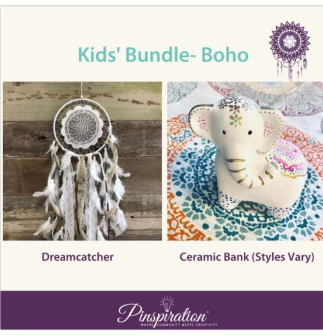 Makers will create a boho-style dreamcatcher and elephant bank, ceramic. This bundle package includes a snack and a juice box.