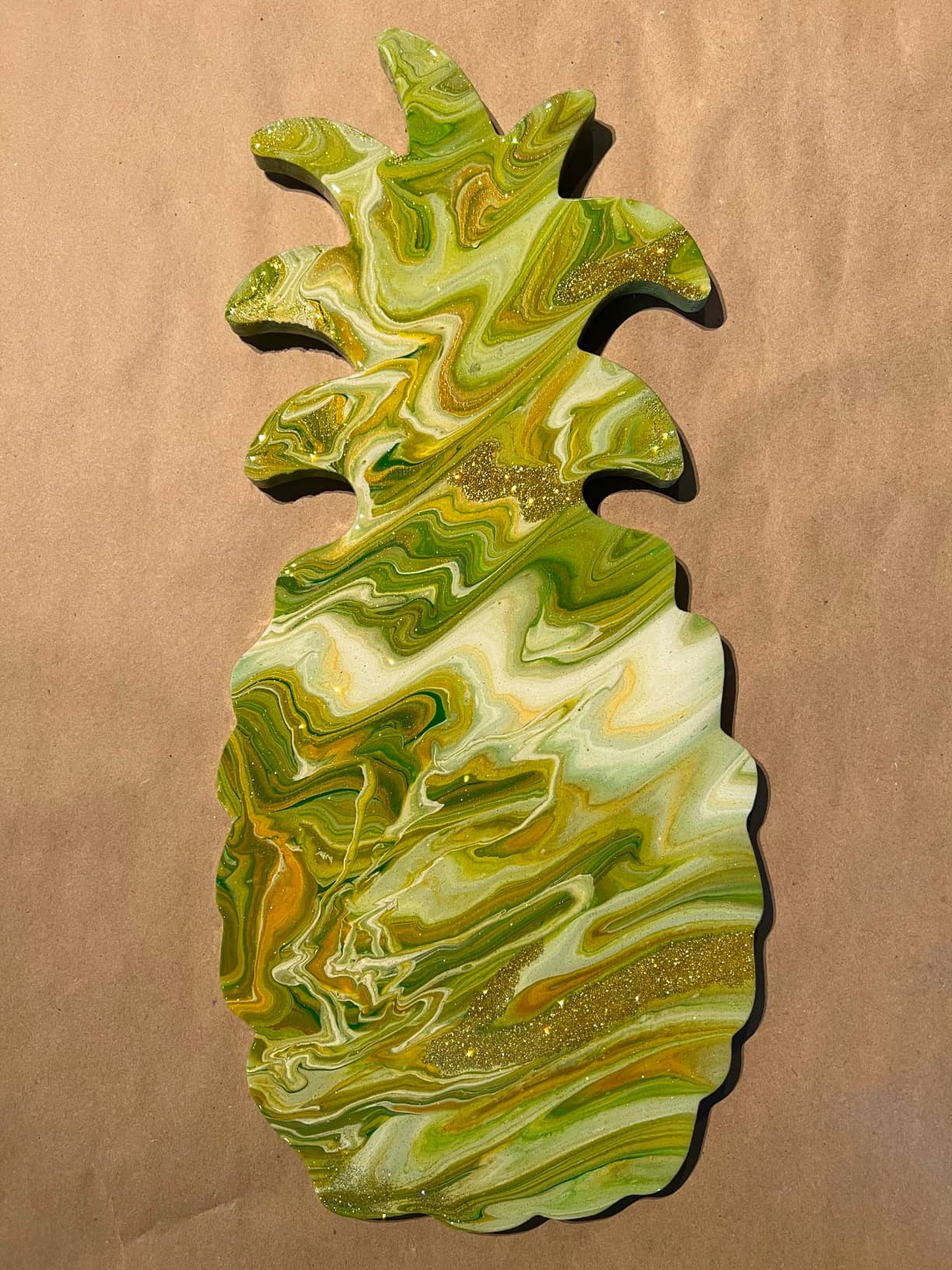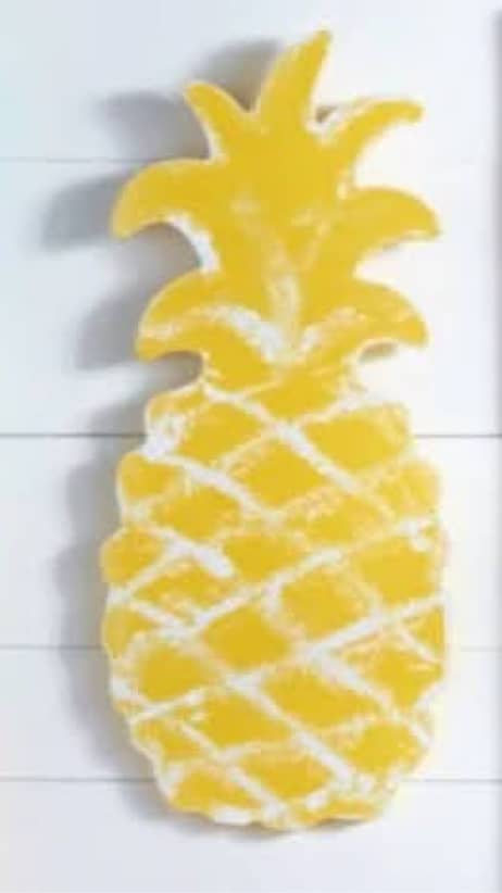 This pineapple cut out is made of 1/2 inch pine plywood and can be painted and decorated using our embellishment station. You can also acrylic pour over top for an additional charge.